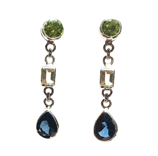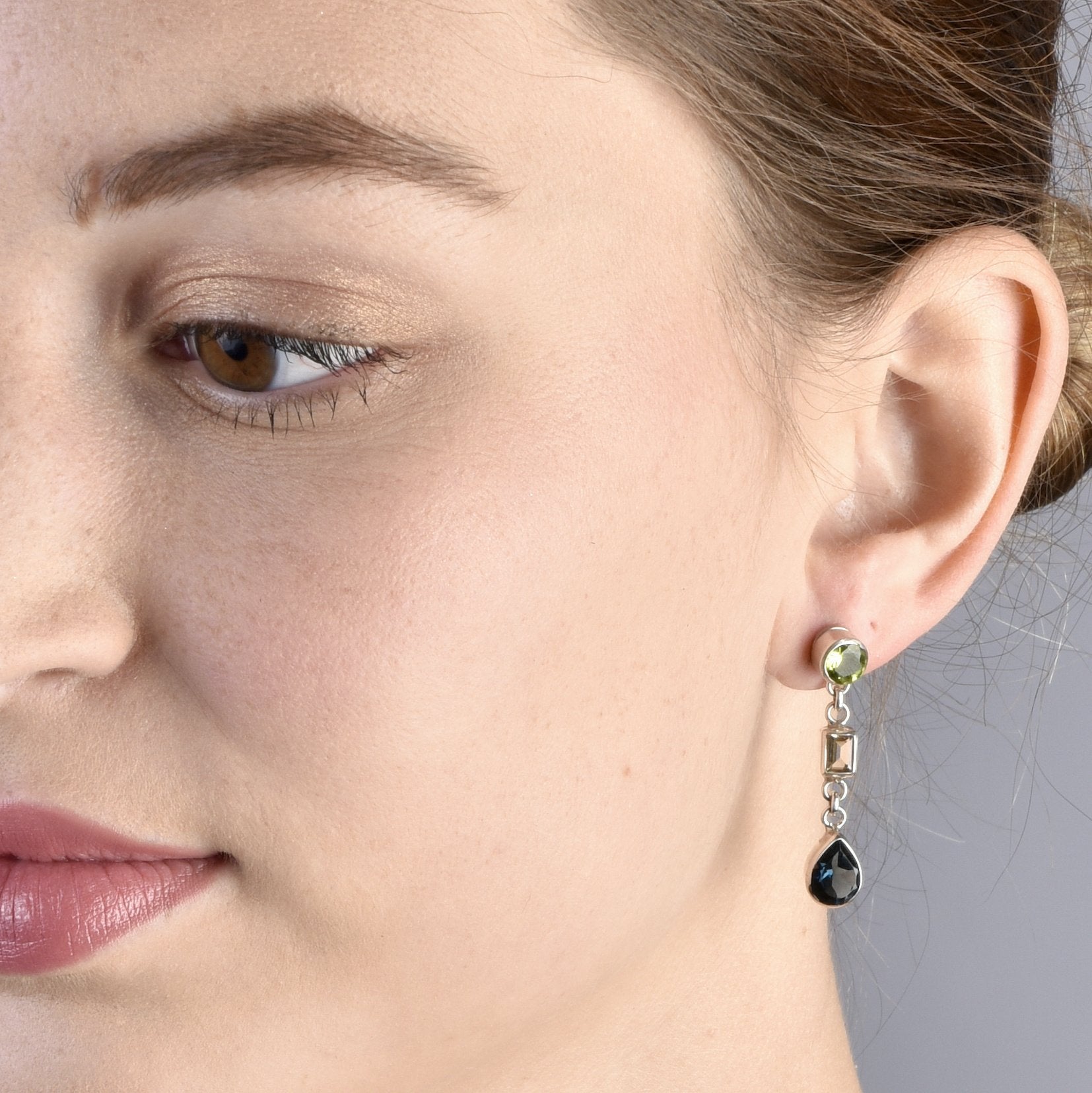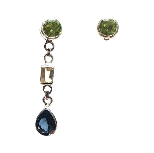 De change oorbellen of verwisselbare oorbellen kun je op verschillende manieren dragen door met de oorknop te variëren. De peridot oorknop kun je zowel met als zonder de imperial topaas en London blue topaas druppel oorhanger dragen.